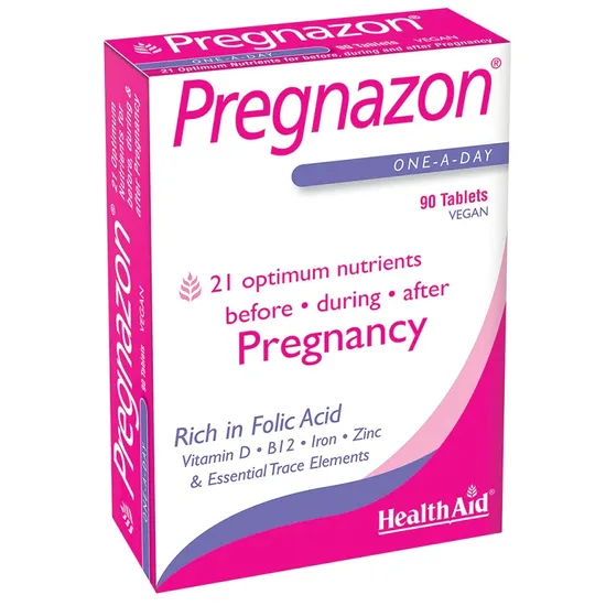 HealthAid Pregnazon Capsules are specially formulated to provide essential vitamins and minerals to support women throughout pregnancy. This comprehensive supplement includes folic acid, which plays a crucial role in foetal development and also contains iron to support red blood cell formation, calcium for strong bones, and vitamin D to aid calcium absorption.
