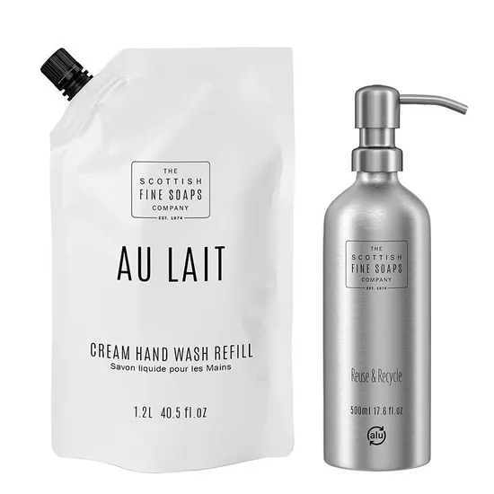 Scottish Fine Soaps Au Lait Hand Wash Refill Pouch & Free Refillable Aluminium Bottle With Pump Duo 1200ml